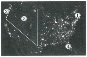 夜间灯光地图是利用卫星对地球各区域的夜间进行遥感拍照,收集地面的灯光照明情况制作而成的,可用来推测人口分布。下图为美国本土夜间灯光分布图(“U”形白色实线被称为该国人口“胡焕庸线”)。据此完成下面两题。