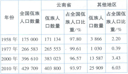 创新题 新情境 佤族是云南省特有、跨国境而居(在东南亚也有分布)的民族,一说由外地迁入,在我国主要定居于云南省西部和西南部、澜沧江以西和怒江以东的怒山山脉南段,约占当地人口的13.5%。区域内山脉连绵,平地极少,故又将佤族居住的地区称为阿佤山。下表示意部分年份我国佤族人口分布情况。据此完成下面三题。