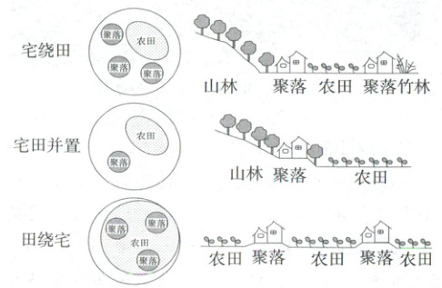 (2)图示“宅绕田”和“田绕宅”的聚落均为组团的形式,紧邻农田,让聚落(住宅)和农田距离更近,以减小耕作半径,便于快速开展农耕活动,节省时间和体力,提升农事生产效率。但二者也有一定区别:“宅绕田”是农田规模有限,因此聚落以组团形式环绕农田,聚落以农田为核心向周围分散;而“田绕宅”则是聚落呈组团状,散布在较大规模的农田之中,聚落周围农田环绕。