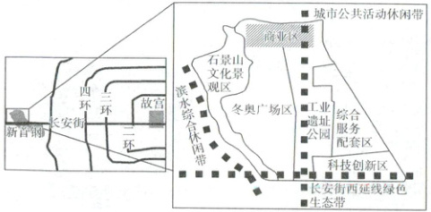创新题 新考法 (2025河南许昌期末)根据《北京城市总体规划(2016—2035年)》,新首钢北部片区依托冬奥会“滑雪大跳台”等比赛场地及公共基础设施进行了创新规划。下图示意新首钢高端产业综合服务区北部片区位置及功能分区规划状况。据此完成下面两题。
