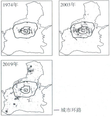 (2025山西合格考)城市的空间结构受制于自然条件、历史文化、经济发展水平等因素,随着城市的发展而变化。下图为1974—2019年西安市某土地利用类型空间布局变化。据此完成下面两题。