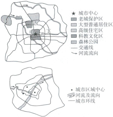 (2025四川成都蓉城联盟期末)下面两幅图示意B市和W市的内部空间结构(比例尺一致)。受不同历史时期城市规划影响,B市形成了独特的“单中心环状扩散”结构;受自然环境等影响,W市形成多个城市区域中心。据此完成下面三题。