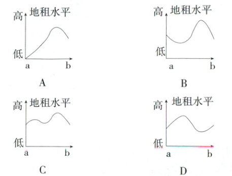 9.B 读图可知,a位于主干道附近,地租水平较高;由a向b,先离主干道越来越远,地租水平明显下降;在接近b附近主干道时,地租水平又越来越高;经过b附近主干道后,地租水平又明显下降,故选B。