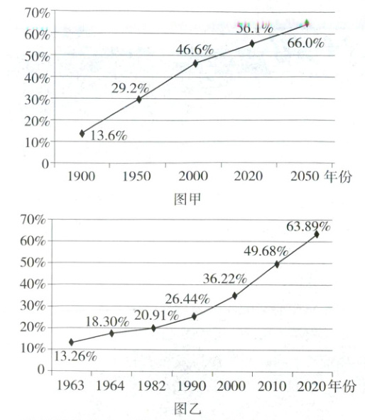 (2025江西吉安期末)城镇化是世界性的潮流。图甲示意1900—2050年世界城镇化水平的变化(2050年的数据为预测值),图乙示意我国七次人口普查城镇化水平的变化。据此完成下面两题。