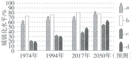 5.B 图示 b 大洲在 2017 年及之前在四个大洲中城镇化水平最高,且增长速度较为缓慢。结合所学知识可知,目前北美洲的总体城镇化水平处于世界第一的位置,已处于增长速度趋缓的后期阶段,因此 b 大洲最有可能是北美洲;欧洲的总体城镇化水平也较高,但目前略低于北美洲,对应图中的 a 大洲;亚洲总体城镇化水平低于欧洲,但高于非洲,因此图中 d 对应亚洲,c 对应非洲。 故选 B。