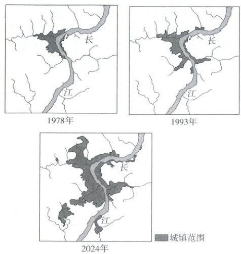 (2025广东广州期末)城镇空间形态演变具有明显的动态特征。下图为我国重庆市万州区不同时期城镇空间形态演变示意图。据此完成下面两题。