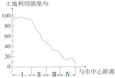 城市土地利用强度是指单位面积的土地所承载的土地经济效益,可以用建设用地面积占该区域土地面积的比值来表示。下图为某大城市土地利用强度空间差异示意图。据此完成下面两题。