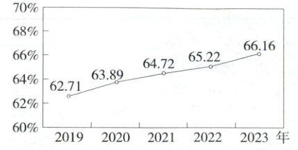 下图示意我国2019—2023年年末常住人口城镇化率变化(横坐标表示年份,纵坐标表示常住人口城镇化率)。据此完成下面两题。