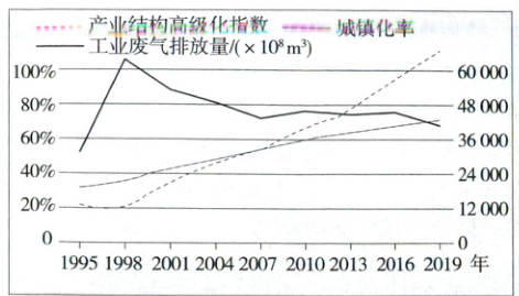 (2)1995—2019年,城镇化率持续上升,说明城镇化水平不断提高;(2分)产业结构高级化指数呈现上升趋势,表明江苏省的产业结构在优化升级;(2分)工业废气排放量则呈现出先上升后下降的趋势,说明空气质量先恶化后逐渐改善。(2分)