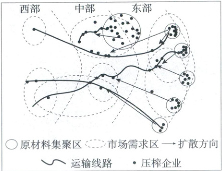 方法技巧:原料导向型工业布局位置的分析方法:首先明确原料来源(如本题中大豆压榨企业的原料主要依靠进口);然后判断主要运输方式(如本题中国际大宗货物以海运为主);最后推导布局逻辑(如本题中大豆压榨企业倾向于沿海布局,以靠近港口,降低运输成本)。