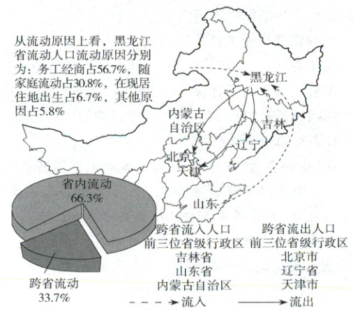 (1)黑龙江省人口流动原因排名第一位的是务工经商,而务工经商的人通常是青壮年,说明流动人口主要为青壮年劳动力;图示省内流动人口占比为66.3%,说明人口流动以省内流动为主;跨省流出人口主要流向北京市、辽宁省、天津市等经济较发达地区。
