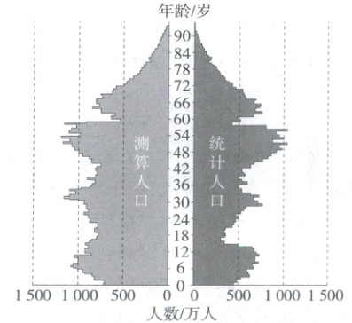 (注:图中横轴为人数/万人,纵轴为年龄/岁,图中灰色区域为测算人口,黑色区域为统计人口)
