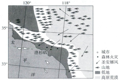 创新题 新情境 (2025江西九江一中等校联考)2025年1月初,强劲的圣安娜风导致美国加利福尼亚州西海岸山区发生严重的森林火灾(如图)。借助风势,火势迅速蔓延,导致加利福尼亚州森林火灾发生区及西部沿海城市带出现了多类别、多层次的生态环境问题。据此完成下面两题。
