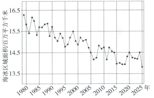 (2025安徽合肥期末)下图为1979—2025年北极海冰区域面积的年度最大值变化图。读图,完成下面两题。