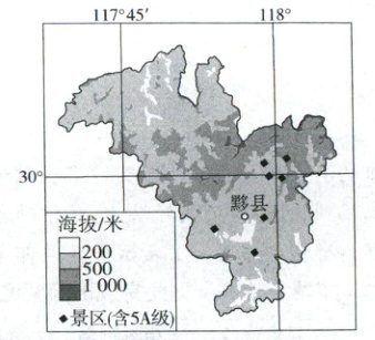 原因:黟县山地多、工业用地少(或工业基础薄弱),加工制造业用工需求少;(2分)当地旅游资源丰富,大量的游客为零售业和住宿餐饮业带来市场(零售业、住宿餐饮业和旅游业形成集聚效应)。(2分)