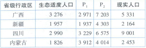 创新题 新情境 (2025四川合格考)生态适度人口,是指从维护生态系统稳定和保证自然资源可持续利用角度来考虑区域的适度人口规模。依据资源、环境状况,有学者提出了广西、新疆、四川、内蒙古四个省级行政区生态适度人口数据(如下表,单位:万人)。据此完成下面两题。