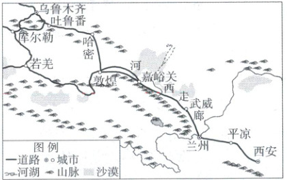 (2025云南师大附中期中)河西走廊位于甘肃西北部的狭长冲积平原上,东起乌鞘岭,西至古玉门关,南依祁连山,北靠内蒙古高原的沙漠和山地,是丝绸之路的重要通道。下图示意河西走廊位置图。据此完成下面两题。