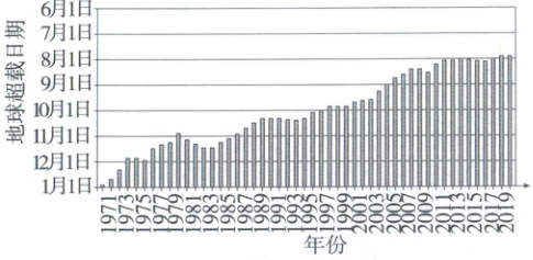 (2025北京东城期末)地球超载日指地球已用完年度可再生自然资源额度,当天进入年内生态赤字状态。下图为1970—2019年地球超载日统计图。据此完成下面两题。