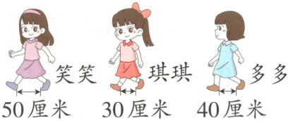 4. 笑笑、琪琪、多多每人一步的长度如下图,她们都从校门走到教学楼,(
