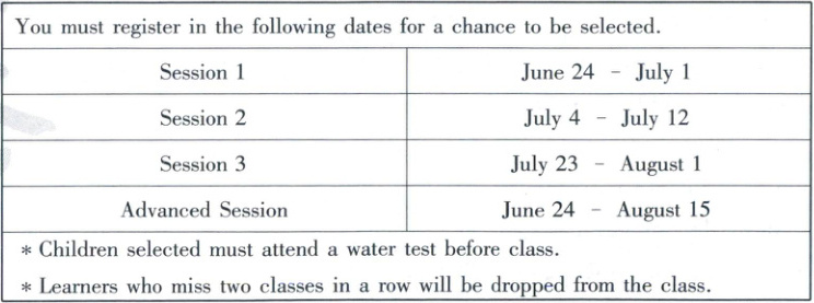 23. A 细节理解题。根据Registration Dates部分的表格内容可知,Session 1的注册期持续8天,Session 2持续9天,Session 3持续10天,Advanced Session持续53天,故注册期最短的是Session 1。