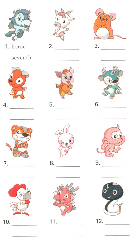 2.sheep; eighth 3.rat; first 4.dog; eleventh 5.pig; twelfth 6.ox; second 7.tiger; third 8.rabbit; fourth 9.monkey; ninth