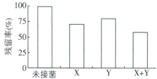 6. [四川 2025·8]微塑料由塑料废弃物风化形成,难以降解,会危害生态环境和人体健康。有人分离到 X 和 Y 两种微塑料降解菌,将总菌量相同的 X、Y、X+Y(X:Y=1:1)分别接种于含有等量微塑料的蛋白胨液体培养基中,培养一段时间后测定微塑料的残留率(残留率=剩余量/添加量×100%),结果如图。下列叙述正确的是 (