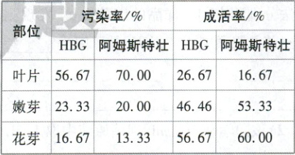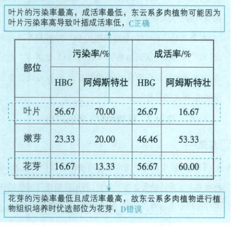 4. [吉林长春东北师大附中 2025 高二期中]东云系多肉植物的繁殖率和叶插率都较低。研究人员以东云系多肉植物品种 HBG 和阿姆斯特壮为实验材料进行植物组织培养,探究外植体选取部位对东云系多肉植物污染率和成活率的影响,实验结果如表。下列叙述正确的是(