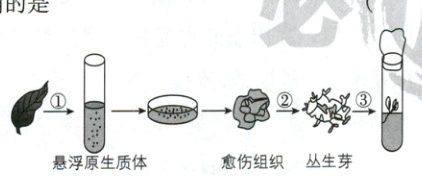 2.B【解析】原生质层是由细胞膜、液泡膜以及这两层膜之间的细胞质组成,过程①获得的原生质体是植物细胞去除了细胞壁后的结构,A错误;获取的原生质体不宜悬浮在低渗溶液中,以防止其吸水涨破,B正确;过程②为诱导芽分化,需要适当提高细胞分裂素的比例,C错误;过程③表示诱导根的分化形成幼苗,在此之前细胞壁已经形成,且秋水仙素不能诱导细胞壁再生,D错误。