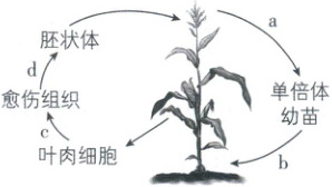 4.D【解析】过程a由花粉得到单倍体幼苗,要经过花药(或花粉)离体培养,A正确。基因型为Aabb的玉米能产生2种基因型(Ab和ab)的花粉,经花药离体培养后可得到2种单倍体幼苗,幼苗再经秋水仙素处理后可得到AAbb和aabb两种基因型的玉米,B正确。细胞具有全能性是指细胞经分裂和分化后,仍然具有产生完整生物体或分化成其他各种细胞的潜能。过程a或过程c、d中植物细胞培育成了完整个体,能够说明植物细胞具有全能性,C正确。c是叶肉细胞培养成为愈伤组织的过程,是脱分化过程;d是愈伤组织形成胚状体的过程,是再分化过程,两个过程均需要一定的植物激素诱导,D错误。