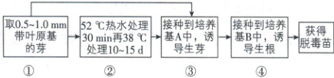 3.C【解析】②过程用52℃热水处理30min再38℃处理10~15d可能使组织中病毒减少或减弱病毒侵染增殖能力,使得脱毒效果更好,A正确;过程③是诱导生芽,需要细胞分裂素的比例比生长素大,B正确;分析题图可知,过程③后已长出芽,能进行光合作用,所以不需要加入葡萄糖,C错误;图示培育过程利用了植物组织培养技术,该过程以带叶原基的芽为外植体,属于无性繁殖,有利于保持亲本的性状,D正确。