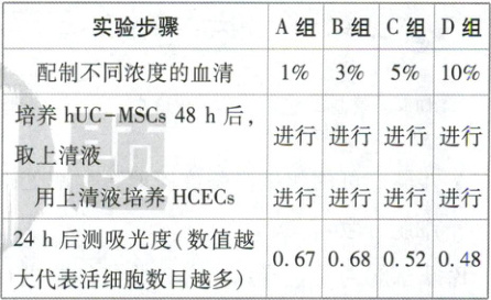4. [河北石家庄 2024 高二期末]人脐带间充质干细胞(hUC-MSCs)广泛应用于神经系统、心血管系统和骨骼肌、皮肤创面的再生和修复。科研人员采用不同浓度血清培养 hUC-MSCs,48 h 后收集各组上清液,用以培养人角膜上皮细胞(HCECs),过程及结果如表。下列相关叙述不正确的是 (