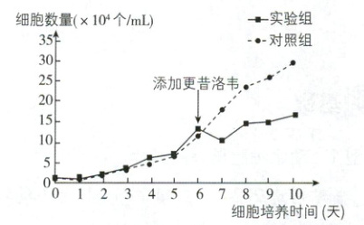 3.D [解析]培养肝癌细胞的过程中需定期更换培养液,以补充细胞生长所需的营养物质,清除细胞代谢物等,A错误;肝癌细胞具有无限增殖的特点,在培养过程中不会发生接触抑制,B错误;对照组应为未导入TK的肝癌细胞,实验组应为导入TK的肝癌细胞,C错误;从图中可以看出,添加更昔洛韦后,实验组细胞数量先减少后缓慢增长,而对照组细胞数量快速增长,说明外源基因TK与更昔洛韦可组成自杀基因系统,D正确。
