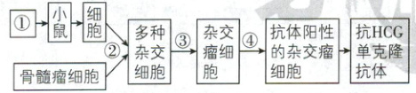 2.D【解析】①过程是向小鼠体内注射人绒毛膜促性腺激素(HCG),目的是获得能产生相应抗体的B淋巴细胞,结合题干“女性受孕后,胎盘会产生一种糖蛋白类激素,叫人绒毛膜促性腺激素(HCG)”可知,孕早期女性血液中含有①过程注射的物质,A正确;②过程可以用灭活病毒诱导动物细胞融合,原理是灭活的病毒可以使细胞膜上的蛋白质分子和脂质分子重新排布,细胞膜打开,细胞发生融合,B正确;常考点:诱导动物细胞融合的方法有电融合法、PEG融合法和灭活病毒诱导法等。③过程需通过特定的选择培养基筛选杂交瘤细胞,在细胞融合后,会存在多种细胞,如未融合的细胞、同种细胞融合的细胞以及杂交瘤细胞等,在特定的选择培养基上未融合的细胞和同种细胞融合的细胞都会死亡,只有融合的杂交瘤细胞才能生长,从而筛选出杂交瘤细胞,C正确;④过程中筛选出的杂交瘤细胞具有癌细胞的特性,能够无限增殖,在体外培养时,一般不会出现接触抑制现象,D错误。