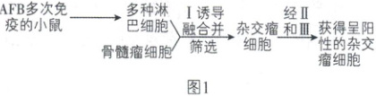 (1)科研人员利用小鼠制备抗 AFB 的单克隆抗体(AFB 单抗),过程如图 1。杂交瘤细胞需进行步骤Ⅱ