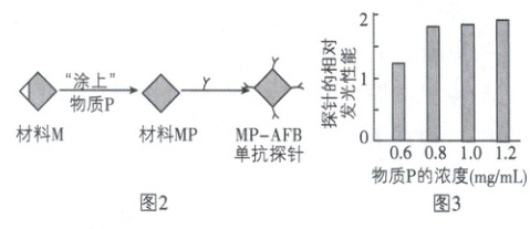 。(3)科研人员拟将 AFB 单抗固定在一种新材料上,制备“检测探针”。已知材料 M 在稳定性、发光性能等方面有明显优势,但它很难与抗体结合;物质 P 可以提高材料 M 对抗体的亲和力。制备检测探针的流程如图 2,探针发光性能与物质 P 的浓度关系如图 3。