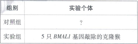 (4)从表中可知,对照组应该选择数量相同(5只)、生理状态与克隆猴相似的未敲除BMAL1基因的同种猴。实验结果表明BMAL1基因与昼夜节律有关,因此,与对照组相比,敲除BMAL1基因的克隆猴(实验组猴)的神经内分泌激素褪黑素分泌减少;与睡眠剥夺、抑郁症以及衰老等相关的基因表达增强;不再按照24小时的周期活动,在夜间活动明显增多。