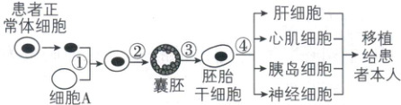 1.C[解析]据图可知,该过程利用了动物细胞核移植、动物细胞培养等技术,A正确;细胞A常用处于减数分裂Ⅱ中期的次级卵母细胞,原因是其细胞质中含有激发细胞核全能性表达的物质,B正确;过程②表示重组细胞发育成囊胚,激发细胞核全能性表达的是细胞A细胞质中的物质,C错误;图示中的胚胎干细胞的核遗传物质来源于患者提供的体细胞,将由此形成的器官移植给患者可以避免免疫排斥反应,故该技术有望解决供体器官的短缺和器官移植出现的免疫排斥反应问题,D正确。