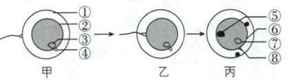 5.B 【解析】甲过程中获能后的精子与卵子相遇时,精子会释放多种酶,溶解卵细胞膜外的一些结构,A正确;图甲中①表示透明带,精子的细胞膜与卵细胞膜融合,卵细胞膜外的透明带会迅速发生生理反应,阻止后来的精子进入透明带,B错误;②是卵细胞膜,精子入卵后,卵细胞膜会发生反应,拒绝其他精子进入卵内,C正确;⑤是雄原核,⑦是雌原核,雌、雄原核充分发育后,相向移动,彼此靠近,核膜消失,D正确。