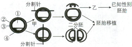 3.B 【解析】胚胎分割所需要的主要仪器设备为体视显微镜和显微操作仪,A正确;在分割囊胚阶段的胚胎时,要注意将结构④内细胞团均等分割,B错误;同一胚胎经分割、移植形成的后代具有相同的遗传物质,该过程中没有发生减数分裂和两性生殖细胞的结合,可以看作无性繁殖或克隆的方法之一,C正确;胚胎移植前进行性别鉴定的方法是取结构③滋养层细胞做DNA分析等,D正确。