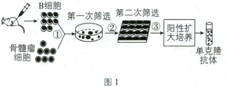 (2)B细胞和骨髓瘤细胞通过①过程进行融合,如果只考虑两两融合,形成的融合细胞共有3种类型,即B细胞与B细胞融合、骨髓瘤细胞与骨髓瘤细胞融合、B细胞与骨髓瘤细胞融合(杂交瘤细胞)。第一次筛选时所用的培养基为选择培养基,未融合的B细胞、骨髓瘤细胞以及同种细胞融合的细胞均不能在此培养基上正常生长和增殖,故能在这种培养基上生长的细胞是杂交瘤细胞。