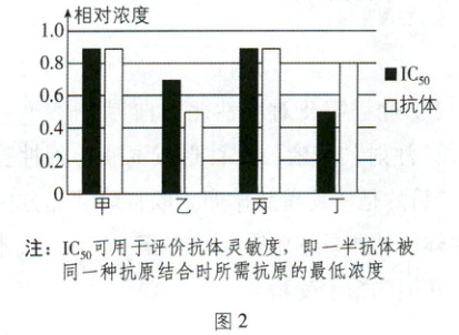 (4)结合图2可知,制备DON单克隆抗体时,最适合作为细胞融合的供体小鼠是丁,依据是丁的血清抗体相对浓度较高,且IC₅₀最低,即抗体灵敏度最高。