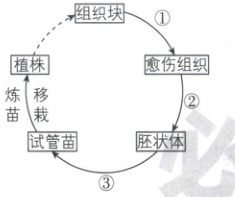 2.C 【解析】过程①是由组织块形成愈伤组织,属于脱分化过程,脱分化过程中细胞通过有丝分裂增殖,A正确;过程②是愈伤组织形成胚状体,属于再分化过程,再分化会形成不同种类的细胞,进而发育成不同组织、器官,B正确;过程②(再分化形成胚状体)和过程③(胚状体发育成试管苗)所用培养基成分、浓度不完全相同,C错误;培养基中糖类可作为碳源,为植物细胞提供碳元素用于合成有机物等,同时糖类能影响培养基渗透压,维持细胞正常形态,D正确。