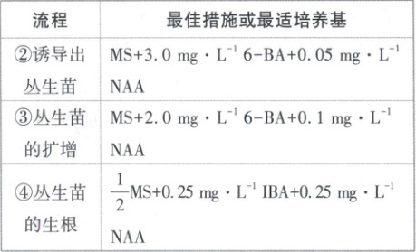 3.B 【解析】流程①是对外植体腋芽消毒,消毒的效果取决于消毒剂的种类、浓度和处理时间等,A错误;由于腋芽中含有分生组织,可以不经过脱分化形成愈伤组织的阶段,直接萌生成幼苗,B正确;分析比较表格数据可知,与流程②相比,流程③培养基中细胞分裂素类与生长素类物质的比值更小,C错误;据表分析,与流程③相比,流程④中NAA浓度提高并添加了IBA,即提高生长素类物质的含量,并使用$\frac{1}{2}MS$培养基降低了盐浓度,从而有利于诱导丛生苗生根,D错误。