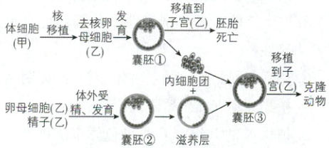 9.D 【解析】克隆动物的核基因组来源于甲,细胞质中的基因来源于乙,A错误;体外受精需用获能后的精子与MⅡ期的卵母细胞受精,而不是MⅠ期,B错误;囊胚①中的内细胞团可发育为个体,滋养层细胞将来发育为胎膜和胎盘的一部分,C错误;由题图可知,体细胞核移植后形成的滋养层不足以支持胚胎完成发育,体外受精后形成的滋养层能够支持胚胎完成发育,故滋养层可影响内细胞团的发育,D正确。