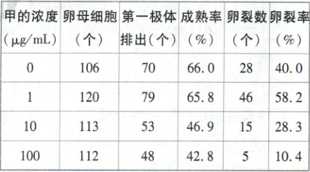 10.A 【解析】根据表格数据分析,随着甲浓度的增大,卵裂率先增大后减小,说明甲浓度较低时促进卵裂过程,浓度过高时抑制卵裂过程,A错误;甲浓度过高时,第一极体排出率降低,说明甲浓度过高抑制第一极体的排出,B正确;用1μg/mL的甲处理后受精卵的卵裂率增大,说明添加1μg/mL的甲可提高受精后胚胎发育能力,C正确;由表格中成熟率、卵母细胞数、第一极体排出数之间的数量关系可知,本实验中以第一极体的排出作为卵母细胞成熟的判断标准,D正确。