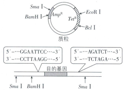 7.D [解析]用同一种限制酶切割质粒和含目的基因的DNA片段后,目的基因可能会反向连接到质粒上,因此目的基因表达的产物可能不相同,A错误;若只使用SmaⅠ切割质粒和含目的基因的DNA片段,会破坏质粒上的氨苄青霉素抗性基因,使含有目的基因的受体菌不能在含氨苄青霉素的培养基中生长,B错误;若选择BamHⅠ和SmaⅠ切割质粒和含目的基因的DNA片段,重组质粒上含有正常的四环素抗性基因,能在含四环素的培养基中生长的受体菌有可能导入了重组质粒,也有可能导入了空质粒,C错误;含目的基因的DNA片段上有EcoRⅠ的识别序列但没有BclⅠ的识别序列,不能使用BclⅠ切割含目的基因的DNA片段,因为Sau3AⅠ切割后产生的黏性末端与BclⅠ切割后产生的黏性末端相同,故若用EcoRⅠ和BclⅠ切割质粒,则需用EcoRⅠ和Sau3AⅠ切割含目的基因的DNA片段,D正确。