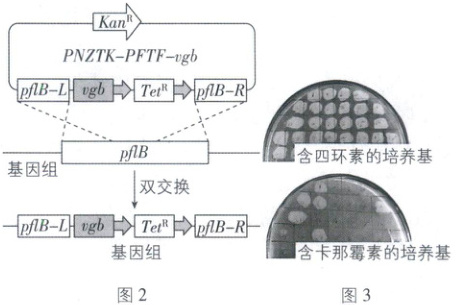 (答出两点)等。(3)图 2 是质粒$PNZTK - PFTF - vgb$转入地衣芽孢杆菌后,将目的基因插入基因组的过程示意图。