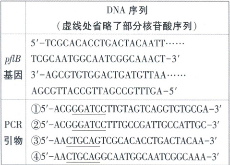 (答两点)等。如表为$pflB$基因序列和设计的相关引物,可选用的引物是①④