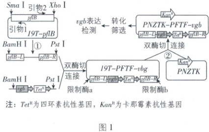 (2)观察图1可知,要将外源vgb基因定向插入I19T - pflB质粒中,构建重组质粒,需要用与切割含目的基因的DNA片段相同的限制酶切割质粒,由步骤①可知,pflB基因两端具有SmaⅠ和XhoⅠ的酶切位点,步骤②双酶切时,是要将Kanᴿ插入pflB - L - pflB - R片段的外侧,需使用的限制酶a和限制酶b分别是SmaⅠ和XhoⅠ。影响DNA连接酶反应速率的因素有反应体系的温度、pH、酶浓度、底物浓度、DNA片段末端类型等,即DNA片段的浓度,DNA连接酶催化的是DNA片段之间的连接反应,底物浓度会影响反应速率。