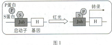 (2)分析题意可知,P和S基因的表达不需要其他条件诱导,因此其表达属于组成型表达,H基因的表达属于红光诱导型表达。由图1可知,在没有红光诱导时,S基因指导合成的S蛋白直接与启动子Jub结合,红光调控下,P基因指导合成的P蛋白与结合在启动子上的S蛋白结合,启动H基因的表达。启动子是RNA聚合酶识别和结合的位点。